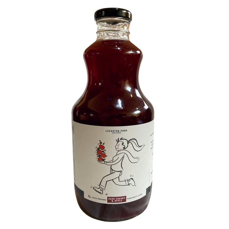 1L glass bottle of cold-pressed apple and cherry juice from Lucaston Park Orchards in the Huon Valley.